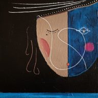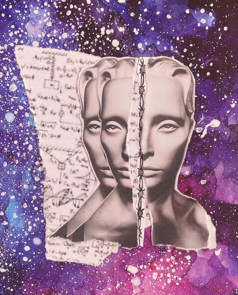 When I include a face in my art, it is female or androgynous, never male. My appreciation of women and the nonbinary, and my ambivalence toward men, informs that choice. This collage is a tip of the hat to John Nash, the Nobel prize winning mathematician who was diagnosed with schizophrenia later in life than most. He’s the subject of the book and movie “a beautiful mind”. My interest in brain science led me to a fascination with neurodiversity which now influences my art.